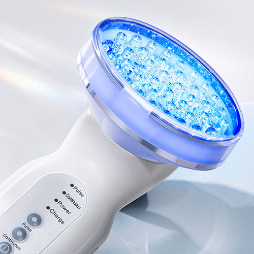 Pulsed + continuous mode blue light therapy device with 40 powerful LEDs designed to clear acne and target blemishes