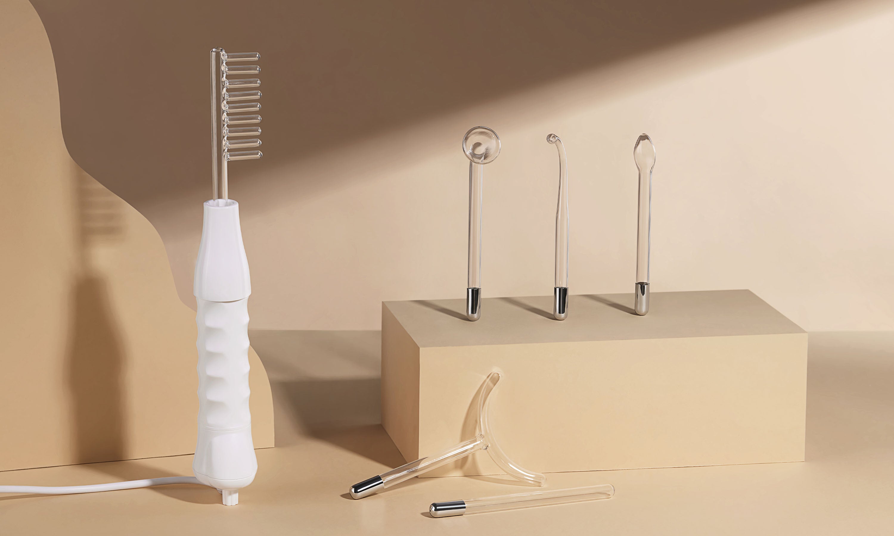 6 ergonomically designed glass applicators created to treat specific contours of the face and scalp. Comb, spoon, long and horseshoe applicators contain neon gas (orange) Mushroom and rod applicators contain argon gas (purple)
