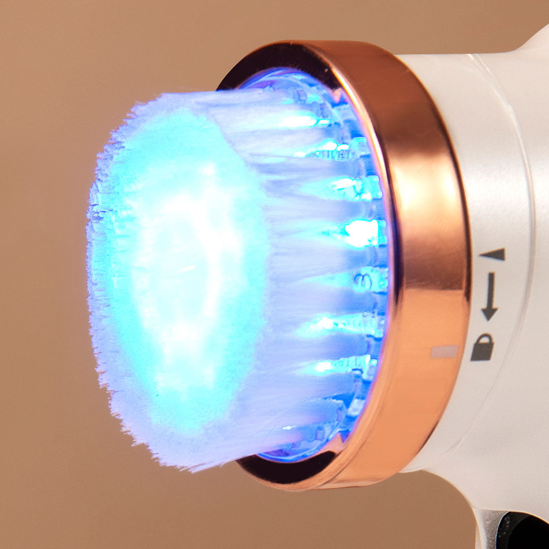 Acne-fighting blue light therapy combined with a battery-powered cleansing brush provides an intense purifying cleanse