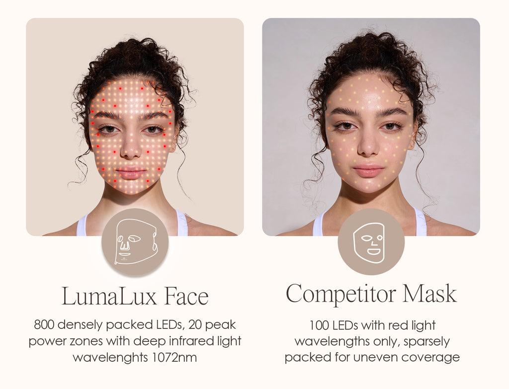 A: The LumaLux collection was born out of a desire to create the most powerful LED light therapy mask for at-home use with a simple and comfortable design. LumaLux uses professional-grade LED light therapy bulbs to deliver 30mW/cm² of power in just quick 3-6 minute sessions. We developed the concept by focusing on optimal light delivery, wavelength precision, and comprehensive coverage. We noticed that most brands average 66 bulbs on silicone masks - but this leaves much of the face untreated. LumaLux Face has 800 densely packed LEDs. You wouldn't apply your skincare to only part of your face, the concept for LED light delivery is the same